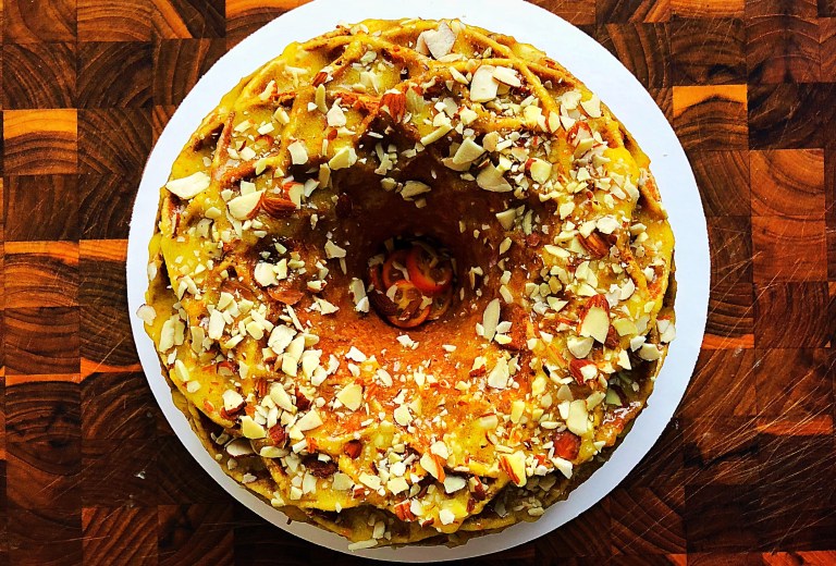 Additionally, I tried this as a large bundt this time around and it took just over 50 minutes to cook through so I can’t comment on how long the tiny bundts might take. If you go that route, I’d suggest testing them earlier rather than later — better safe than sorry! Either way, the puree gives a lot of moisture to this cake — so could be potentially pretty forgiving.