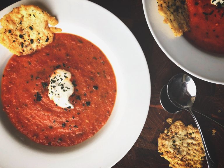 To combat a sequel of the winter blues, I whipped up this super easy, delicious and comforting (not-to-mention, no fuss!) version of tomato soup. Top with a dollop of sour cream and Parmesan crisps and whatever snow is outside your window will melt away…well, figuratively, at least.