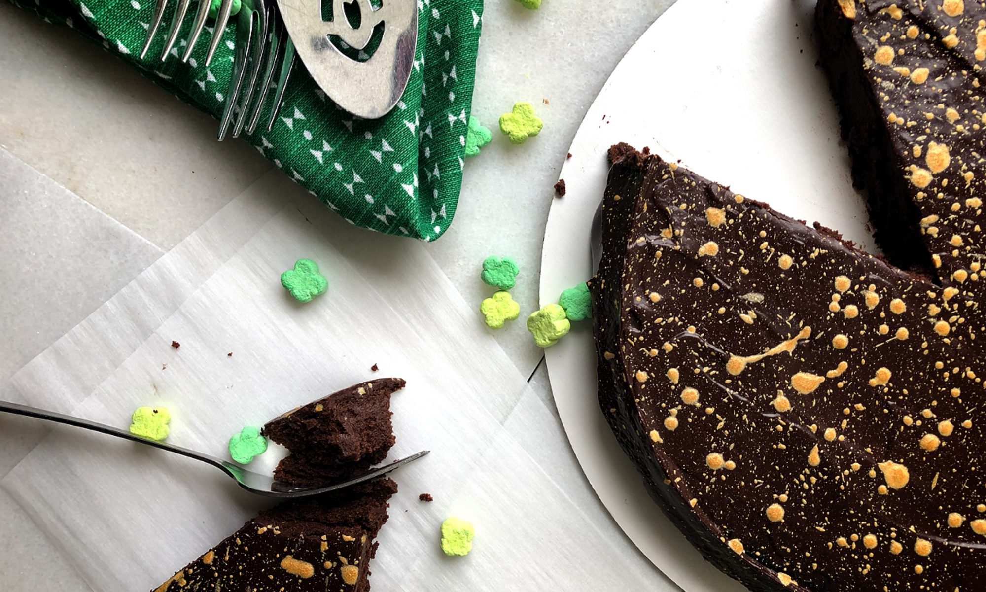 A simple, rich cake with a mousse-like texture (gold-splatter-optional). Count. me. IN! Pair this beauty with an ice-cold glass of Bailey’s (yeeeahhh), some vanilla ice cream or some fresh whipped cream!